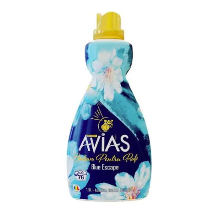 Produsul AVIAS Balsam Rufe BLUE ESCAPE (albastru) igienizeaza, catifeleaza si protejeaza tesaturile, previne electrizarea rufelor usurand calcatul acestora. Datorita formulei sale, confera rufelor un aspect pufos, prospetime si parfum placut.